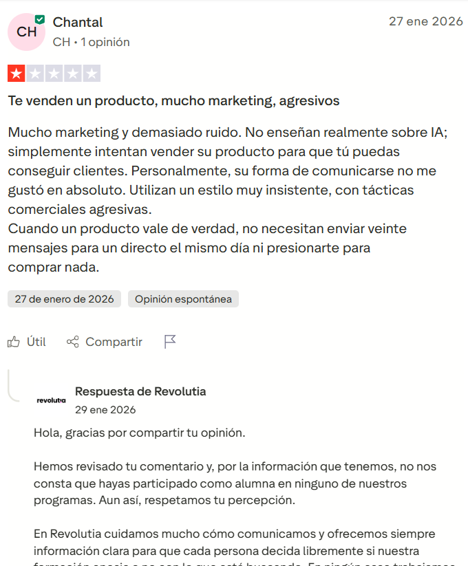 Revolutia acumula 117 opiniones reales en Trustpilot con una puntuación de 4.6 sobre 5. La mayoría de los testimonios positivos coinciden en tres puntos: la calidad del soporte, el enfoque práctico de la formación y el valor de la comunidad.